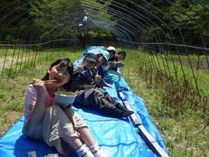 田おこしの日のお昼は、ご飯隊が朝からせっせと準備をしてくれたお弁当です。自分たちで耕した田んぼを見ながらのご飯は格別に美味しいね!