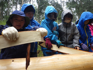 森の中を歩いていると、伐倒した木を見つけました。木の皮をはがしてなめてみるとちょっぴり甘い!知らないことをたくさん発見できる森歩きは楽しいね。