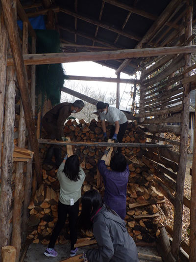 割った薪はどんどんと積んでいきます。登り窯で使う薪の量はかなりの量なのでこどもたちの身長をはるかに超える高さに何列も積んで乾かします。崩れないように高く積む、これも技術と根気が必要です。