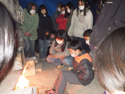 薪くべをするときには、頭、目、口元をしっかりと覆わないとあっという間にやけどしてしまいます。