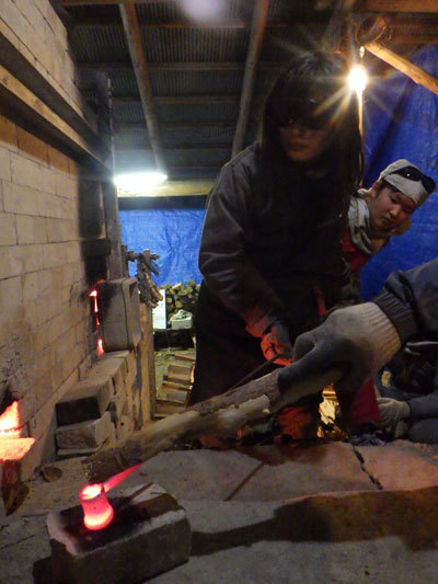作品が溶けたかどうか判断する材料はいくつかありますが、もっとも重要視しているのが実際に出してみて確認することです。真っ赤になった“色見”というテストピースを慎重に出して釉薬の溶け具合を確認していきます。