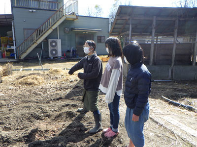 こちらは畑を見ながら話し合っているなっちゃん・みー・ふーみんです。来年度のために常備野菜であるジャガイモを植える計画をしました。「ジャガイモの畝はどこがいいかな?」と相談しています。