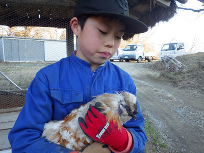 ニワトリが安心してまきの腕の中で眠っています。毎日ニワトリの様子を見たり、小屋の掃除をしたりと大切にお世話するからこその関係性です。