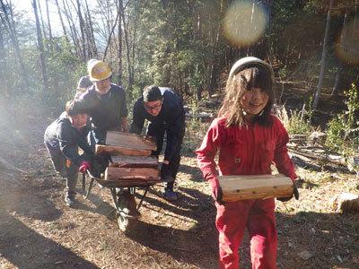 来年度に向けて、お風呂薪をとりにいつも作業をしている森に出かけました。せっせと薪を1本ずつ手で運ぶ仲っちの後ろで力持ちメンバーが一輪車で一気に10本を運んでいます。ひとりひとりができる力を持ち寄るのがだいだらぼっちです!