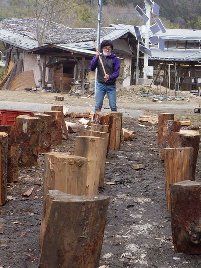 あだっちーが薪を割っています。日々の努力で薪割りが上達した2年目のあだっちーは今や連続で25本の薪を割ってしまいます!薪割りのおもしろさも来年度のメンバーに引き継いでいこうね。