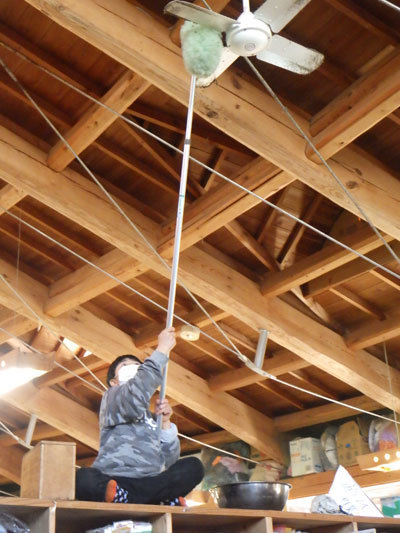 そして忘れてはいけない大仕事が“大掃除”です。広いだいだらぼっち隅々まで掃除します。いつもはたくさんの本が並んでいる本棚もこの機会に全部だしてきれいにしました。
