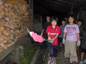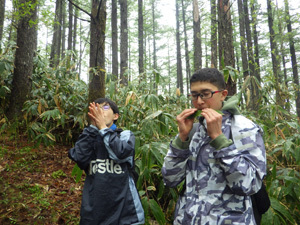 登山の途中にニコルとKがおもむろに草笛をし始めました。上手く音を出すには、どう吹けばいいの?やわらかい葉っぱの方が音が出やすいよ!と中学3年生コンビは疲れた様子もなく元気いっぱいです。山に響き渡る草笛の音が心地いいね。