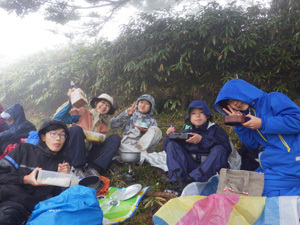 天候の関係で頂上まではたどりつけなかった富士見台登山。それでも、頑張って登った分お腹はペコペコです。持ってきたカレーを温めて、山盛りのご飯にかけていただきます!カレーが疲れた体に沁みわたり、みんなの笑顔が輝いています。