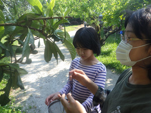 草木染めに挑戦するため、材料となる葉っぱを集めています。「ビワの葉っぱは緑色だけど、染めると何色になるんだろう?」とワクワクしながら集めています。