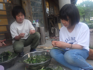 葉っぱを集めた後は、葉っぱを細かくちぎっていきます。草木染めは鮮度が命。採った後すぐにやることが美しい仕上がりの秘訣です。