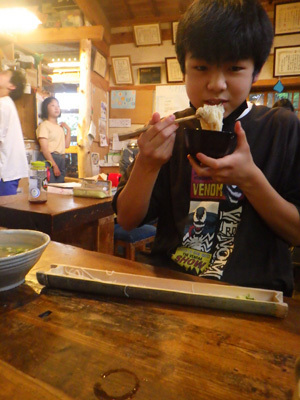 よく竹を使ったものづくりをやっているヒロマサ。今回は竹皿です。自作の竹皿に盛りつけたそうめんをすすりながら「やっぱいいな」と一言。自分で作った皿で食べる食事は格別です!
