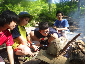 森に着いたら、早速晩ごはん作りのために火起こしです!鍋が置きやすいように木の組み方を一工夫します。いつも風呂焚きで火起こしをしていますが、キャンプでの火起こしは一味違ったものです。