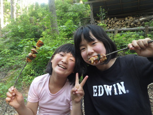 待ちに待った晩ごはんの1つは焼き鳥!前日に食材を漬け込み、そして串は森で拾った枝から手作りというこだわりが詰まった一品です。手の込んだ手作り料理の楽しみと美味しさを存分に味わいました。