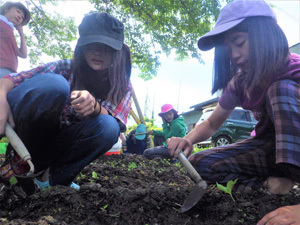 村の方のお庭でスナップエンドウを採っているラムネとみーです。「こんなに採っていいの?」「生で食べてみても美味しいよ!」と土から2メートルほど高くそびえるエンドウに興味津々なこどもたちでした!