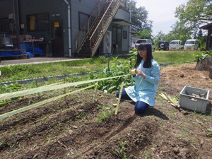 植えたばかりの大豆が鳥に食べられないように対策をしています。ピコは畝1列ずつに丁寧にビニールテープを張りました。大豆の収穫量を上げるため、このひと手間が大事なんです!