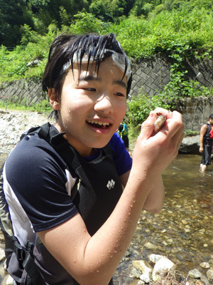 暑くなれば川遊び!川遊びでは魚を手づかみでゲットしました!にゅるっと逃げ出しそうな魚をしっかりと掴み取ります。初めての体験に「本当にとれるんだ!!」と興奮気味のあだっちーでした。