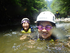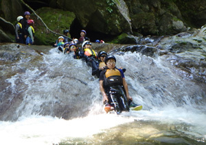 沢登りをした先に現れたのは天然のウォータースライダーです!みんなで連結して流れました。この大自然がこどもたちにとっては最高の遊び場です!