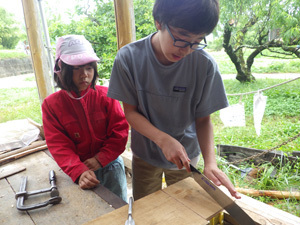 本焼きの火の番をしていない時間にも自分たちの暮らしに必要な仕事を進めるこどもたちです。あだっちーと仲っちはニワトリ小屋に使う板をノコギリで切っています。忙しい毎日の中で空いている時間をいかに使うかが鍵です!