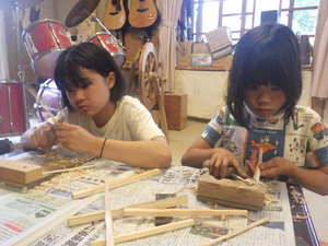 本焼きでは毎日の食事で使うお皿を焼いていますが、お箸だって自分の手で作ります。長さ、太さ、形、それぞれが使いやすいものを目指して削っていきます。全部揃えて食べる日が楽しみだね!