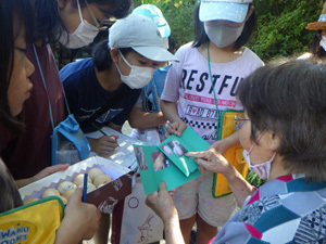 今度は、鶏に詳しい村の人に聞き込み調査をしに行きました。だいだらぼっちの鶏の写真や、産んだ卵を見せながら詳しくお話を伺います。