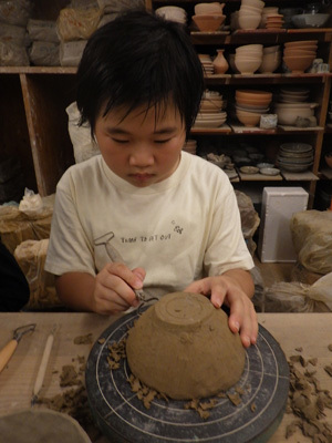 まなみは、電動ろくろの練習に励んでいます。最初は思うようにいかない電動ろくろ。苦戦していますが、手びねりではできない薄くて丈夫な焼き物が作れます。やればやるほどうまくなる。これがおもしろいのです。練習を積み重ねて上達していこう!