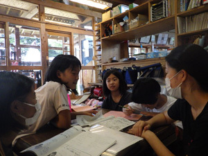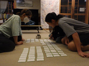 だいだらぼっちOGのちーと百人一首対決!ちーは、山賊キャンプのボランティアとして来てくれていました。OGとつながり遊べる夜の時間。みんなでワイワイ過ごします。