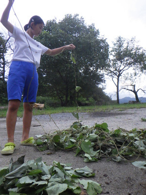 なつが庭に大量発生している葛の葉を集めています。この葉っぱで染め物をするのだとか。このちょっと困ってしまう葉っぱもきれいなグリーンに染まるのです。庭も片付いて、きれいな染め物もできて一石二鳥です。