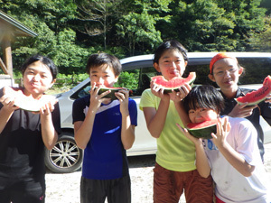 川遊びの後は、ご近所さんに頂いたスイカを食べました。川の水で冷やしたスイカはとっても甘くて、川遊びで疲れた体に沁みわたります。最高の贅沢です。