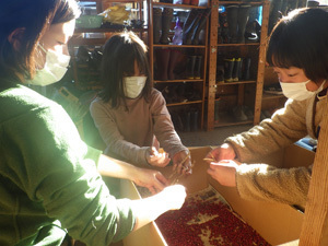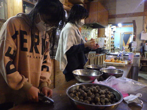 むぎちゃとピコが、くるみの殻を割って、実を取り出す作業をしています。クルミをオーブンで焼いたり、フライパンで炒ったりしていると香ばしいいい匂いが漂ってきます。お勝手が秋のいい匂いでいっぱいになりました。