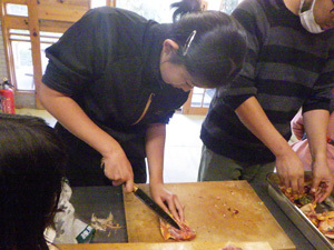 羽を抜いた鶏をさばくと、私たちがいつもいただいているお肉の姿になっていきます。普段食べているお肉は、鶏何羽分になるね…と、普段の食生活を振り返っていました。