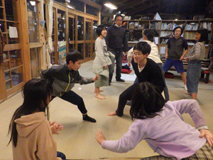 こちらはソーラン節の練習です。学校でも練習している中学生がやったことのない小学生にひとつずつ振りを教えています。「難しいけど追いつけるようにがんばる!」とどんどん習得する小学生でした!