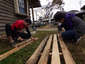 あだっちーとニコルは来てくれる人たちが、焚火のまわりでホッと一休みできるようにとベンチを作っています。当日楽しんでくれていることを想像すると仕事もよく進むね。