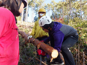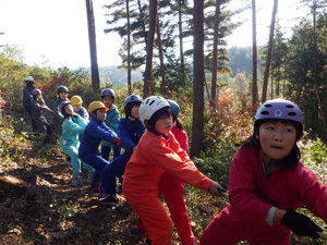 あとは引っ張るのみ!大きなかけ声で息を合わせて、思い切りロープを引きます。1人では、どうにも動かせない木もみんなで引けばみるみる動きます!!