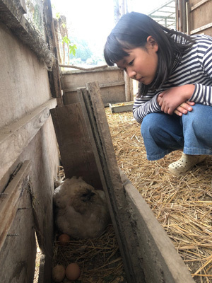 今までは機械で卵をかえしていましたが、ニワトリが卵をあたため、生まれたヒナを育てる自然の営みに任せようと話し合いました。そのため、ニワトリに卵をあたためてもらっています。ヒナが生まれるのが待ち遠しいね!