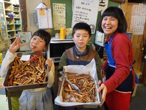 だいだらぼっちで収穫したり、村の方からいただいたりしたさつまいもが、まだまだたくさんあります。今回は素揚げとお砂糖味の芋けんぴを作り、美味しくいただきました!
