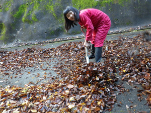 だいだらぼっち祭りの準備で忙しい日々ですが、村の道路愛護には欠かさず参加します。たくさんの落ち葉が広がる道路を掃除したり、溝に溜まった落ち葉をかき集めたり、休まず働きます!