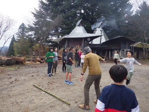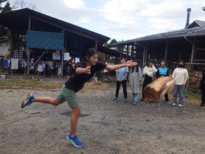 続いて、力自慢です。重たい薪を飛ばした距離で勝負します。力持ちのなつが薪を投げる姿、かっこいいです!