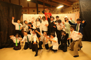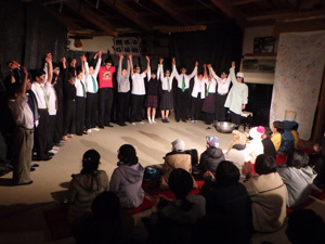 今回の劇はゾンビの劇でした。ゾンビメイクをして血のりをつけて、ゾンビになり切った役者たち。音響、照明の裏方。18人でやり切った劇に、村の方たちにも感動してもらえたと思います。みんなお疲れさま!