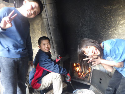 「いい感じ!!しっかり燃えてる!」1年目のこうだいとねんは、初日から五右衛門風呂焚きに興味深々です。試行錯誤して組み立てた木が、順調に燃え進んで大喜び!