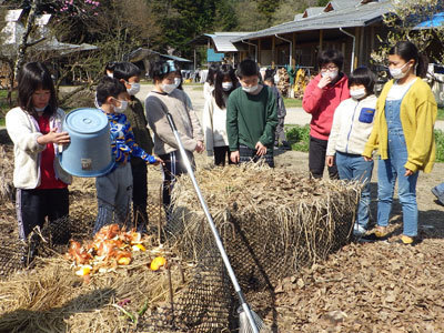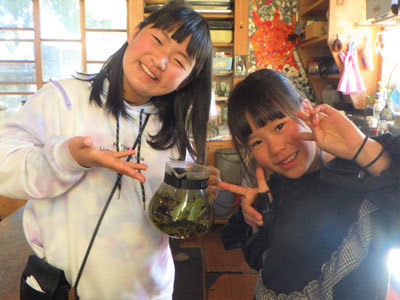 トリシアと仲っちゃんがチャレンジしたのは“びわの葉”のお茶です。葉を集めて、炒って、煮出しました。「ほうじ茶みたいで美味しい!」と大満足です。自然の恵みはまだまだ知らない世界がいっぱいだね!