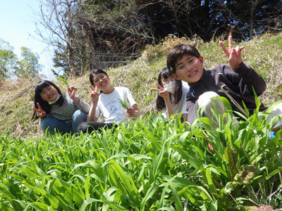 春のお楽しみ“山菜採り”をしました!と3年目のまなみが「季節を逃さないように!」とだいだらぼっちの周りに生えている山菜を教えています。1年目のメンバーは「ただの草が食べれるの?!」と夢中で採りました。不思議なことに今までこどもたちの目に雑草に見えていたものが心躍るごちそうに見えてきます。