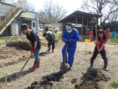 種を植える準備として、道具で土をほぐしていきます。初めて畑作業をするこどもたちにとっては中々ハードな作業ですが、「今土づくりをがんばれば野菜の収穫量も増えるよ!」という継続メンバーの声に励まされ、がんばりました!