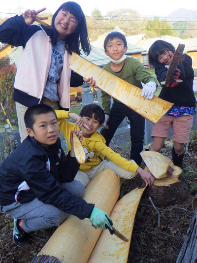こちらは薪作業です。お風呂もストーブも薪を燃料としているだいだらぼっちではこどもたちが山を訪れ、薪を集めます。手と足を動かし汗をかいて働いた分だけ、薪で焚くお風呂が気持ちよく感じるね。