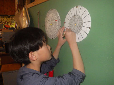 1年目のあきとが、『片付け』の役割分担ルーレットを作成しているところです。だいだらぼっちでは、流し場の掃除なども自分たちでやります。片付けの担当が一目で分かるように工夫しています。