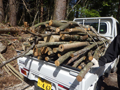 夕方までせっせと働き、トラックの荷台いっぱいに薪が集まりました。一日中働き、ヘトヘトのこどもたちでしたが、山盛りの薪を見て大満足の様子でした。