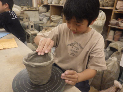 一本づつ紐状の粘土を輪のように積み重ねていく技法、「輪積み」でコップを作ります。指先の感覚を研ぎ澄ませ、思い思いの形に作ります。