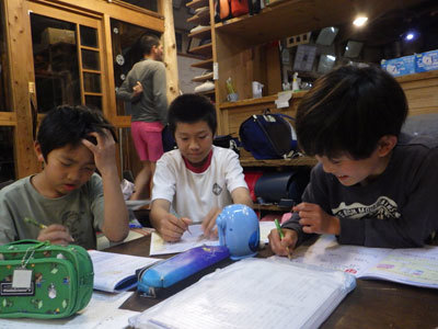 話し合いや夕食の隙間を狙って宿題。暮らしの仕事もこなすだいだらぼっちのこどもたちは毎日大忙しですが、学校の生活もおろそかにはできません。両方頑張るのがだいだらぼっちの暮らしです。