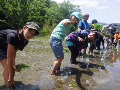 4月から準備を進めてきた田んぼ。ようやく田植えを迎えました。晴天に恵まれ、田植えスタートです。