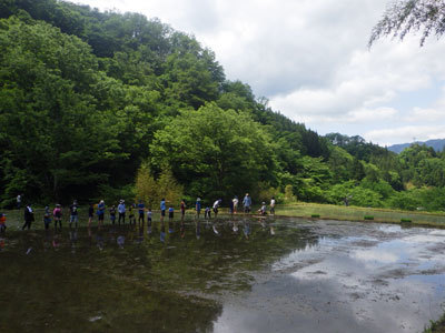 だいだらぼっちの田植えは手植えです。水糸を何本も張り、一列ずつ丁寧に植えていきます。昔ながらの方法は時間も労力もかかりますが、OB/OG、保護者の方も集まってだいだら一家総勢50人で植え切りました。さぁ、秋の収穫が楽しみです。