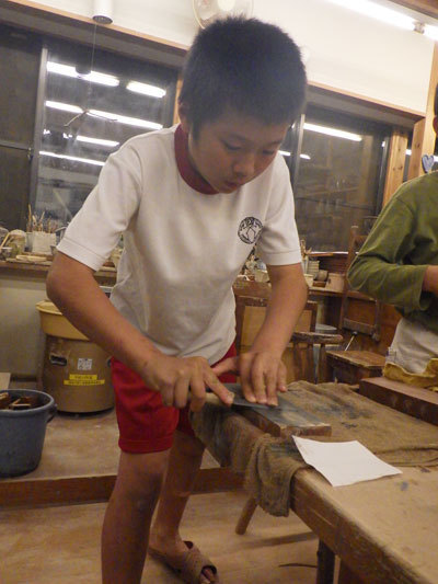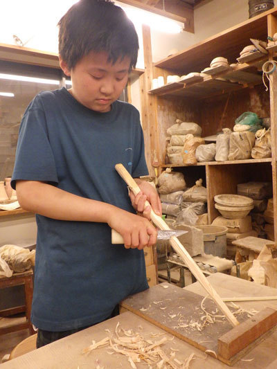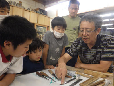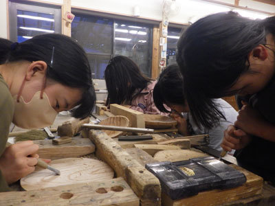 講習の後は実践です!小刀の扱いは見ていると簡単そうに見えても、実際やってみると難しいもの。す~っと削るにはどうしたらいいのか?削る方向を変えたり、力加減を変えるなど試行錯誤しながら取り組んでいます。